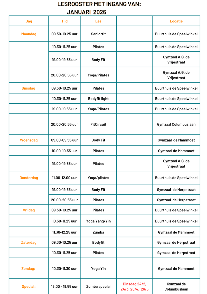 19.00 –  19.55  uur     Body Fit – Gymzaal A.G de Vrijestraat 20.00 – 20.55 uur     Yoga/pilates – Gymzaal A.G. de Vrijestraat